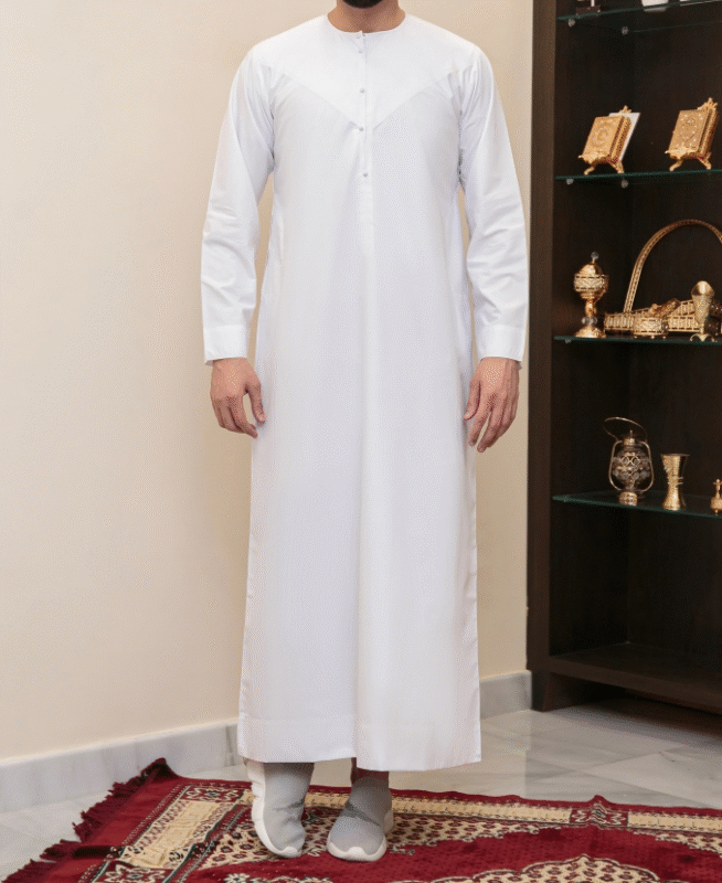 Step into sophistication with our White Emarati Thobe, crafted from premium imported spun fabric and stitched to perfection. Designed with fine detailing, two side pockets and a relaxed Emarati cut, this thobe offers unmatched comfort, durability and elegance — perfect for daily wear, Jummah and formal Islamic occasions.